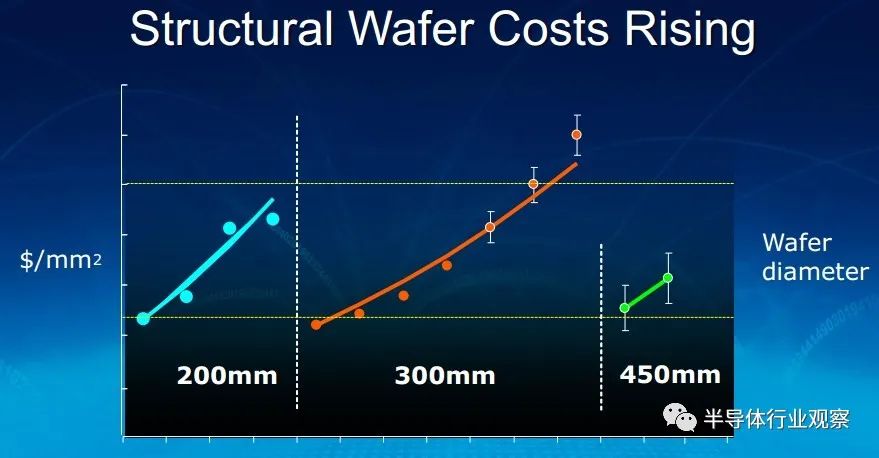 SEMI曾预测每个450mm晶圆厂将耗资100亿美元,但单位面积芯片成本只下降8%。高额的资金压力,以及并不显著的良率和效率的提升,使得行业减缓了向450mm迈进的步伐。